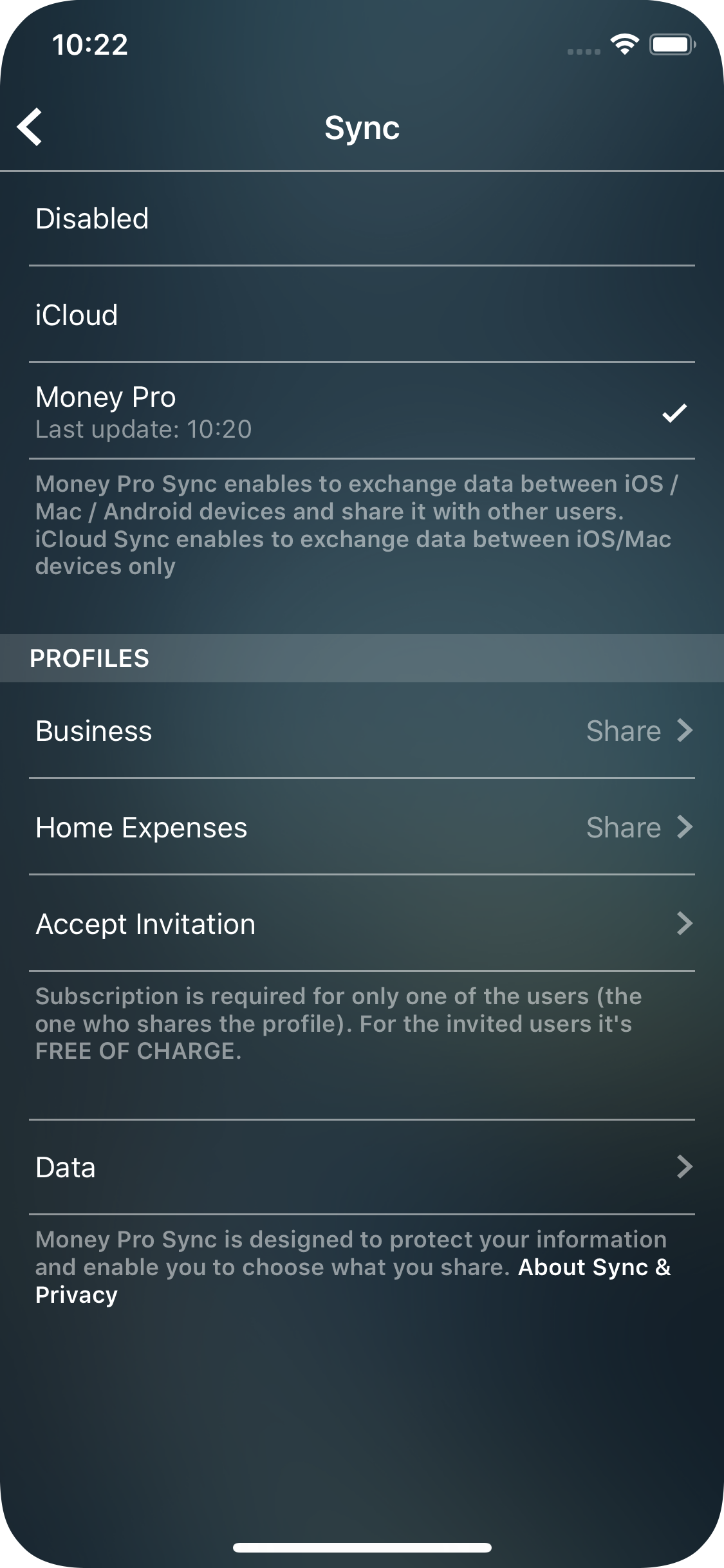 If you are a Family Sync subscriber you can easily switch to Money Tracker Sync service. Besides sharing your data with other users you will be able to sync your data across iOS/Mac/Android devices.