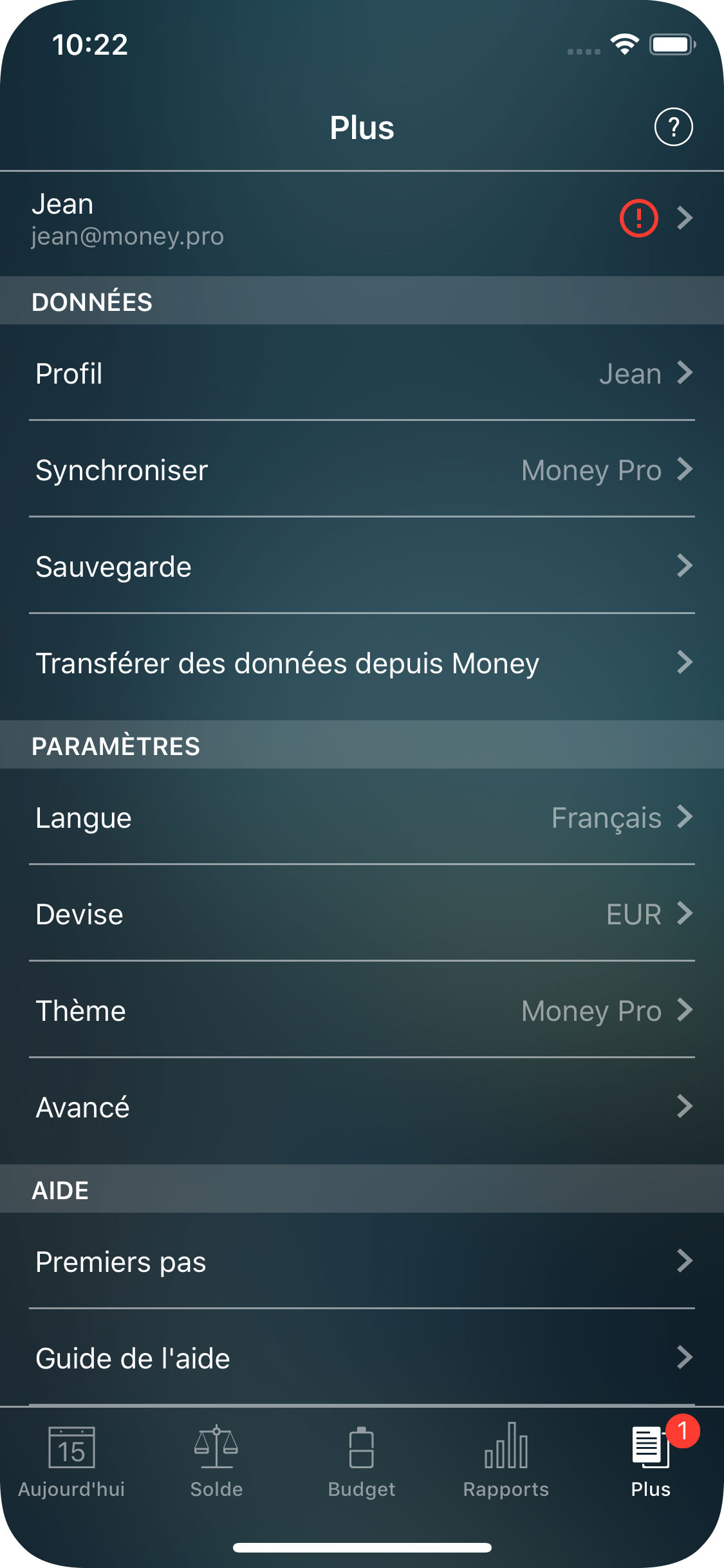 1. Lancez Money Tracker et allez dans l’onglet Plus. Vérifiez que vous êtes connecté à votre compte Money Tracker sur l’appareil. Si vous ne l’êtes pas, allez dans votre compte Money Tracker et connectez-vous.
